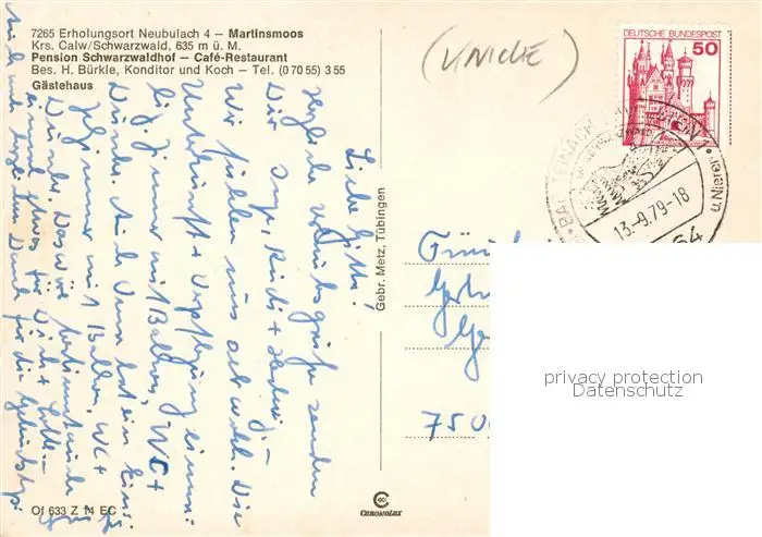 73835668 Martinsmoos_Neubulach_BW Pension Schwarzwaldhof Cafe Restaurant Gaestehaus postalisch gelaufen 1979 Erhaltung siehe scans [WerneD78] [WernPID7 ]