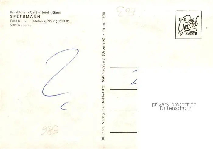 73836234 Iserlohn Konditorei Cafe Hotel garni Spetsmann Iserlohn postalisch nicht gelaufen nach 1965 Erhaltung siehe scans [WerneD78] [WernPID7 ]