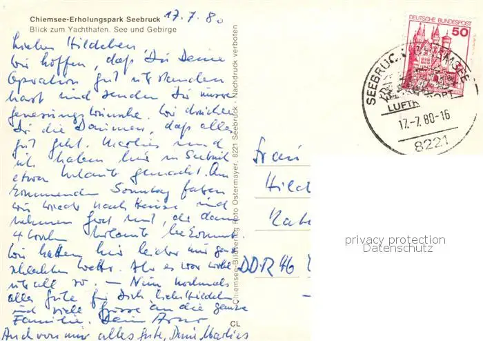 73837443 Seebruck_Chiemsee Blick zum Yachthafen See und Gebirge Seebruck Chiemsee postalisch gelaufen 1980 Erhaltung siehe scans [FriedD77] [Frierer ]
