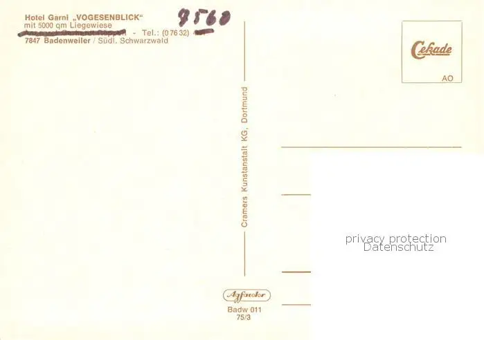 73838070 Badenweiler Hotel Garni Vogesenblick Badenweiler postalisch nicht gelaufen 1975 Erhaltung siehe scans [FriedD77] [Frierer ]