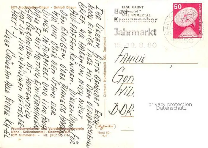 73838080 Hochstetten-Dhaun Schloss Dhaun Restaurant Kegelbahn Grillplatz Hochstetten-Dhaun postalisch gelaufen 1980 Erhaltung siehe scans [FriedD77] [Frierer ]