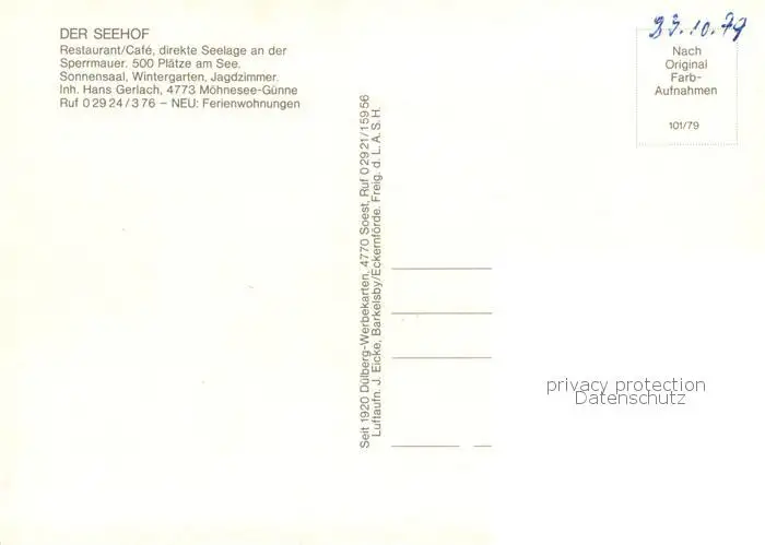 73838106 Guenne_Moehnesee Restaurant Cafe Der Seehof Fliegeraufnahme Gastraeume Kuchentheke Guenne Moehnesee postalisch nicht gelaufen 1979 Erhaltung siehe scans [WerneD78] [WernPID7 ]