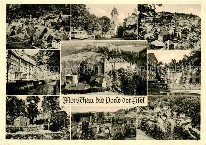 73839620 Monschau Panorama Teilansichten Burg Kirche Monschau postalisch gelaufen 1956 Erhaltung siehe scans [WerneD78] [WernPID7 ]