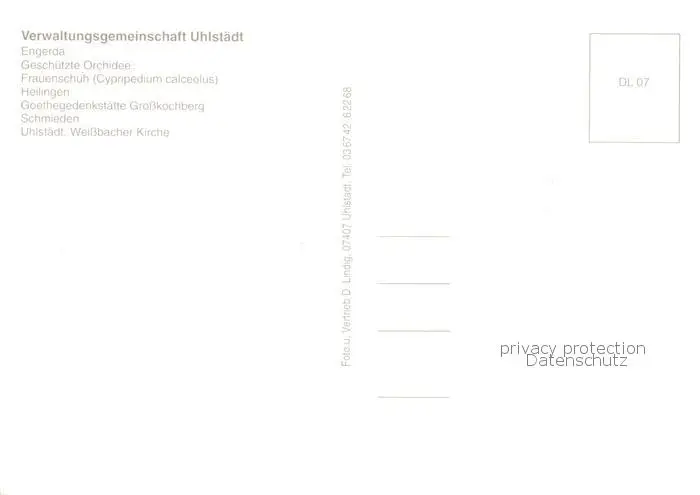 73840207 Uhlstaedt-Kirchhasel Engerda Orchidee Frauenschu Heilingen Goethegedenkstaette Grosskochberg Schmieden Weissbacher Kirche Uhlstaedt-Kirchhasel postalisch nicht gelaufen nach 1965 Erhaltung siehe scans [FriedD77] [Frierer ]