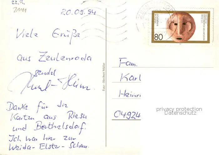 73840507 Zeulenroda-Triebes Karpfenpfeifer Statue Zeulenroda-Triebes postalisch gelaufen 1994 Erhaltung siehe scans [FriedD77] [Frierer ]