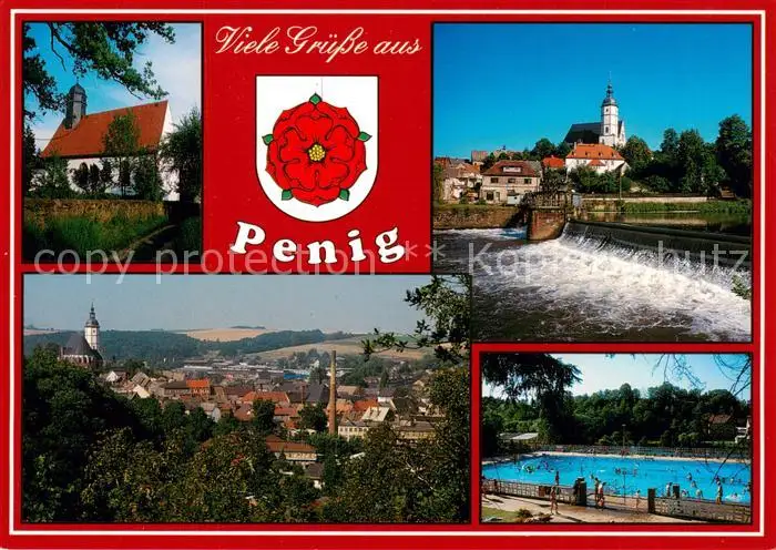 AK / Ansichtskarte 73840734 Penig Santk Aegidien Kirche Muldenwehr mit Stadtkirche Panorama Schwimmbad Penig