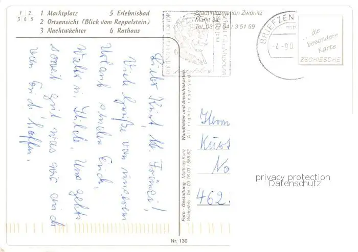 73840737 Zwoenitz Marktplatz Ortsansicht Nachtwaechter Rathaus Erlebnisbad Zwoenitz postalisch gelaufen Erhaltung siehe scans [WerneD78] [WernPID7 ]