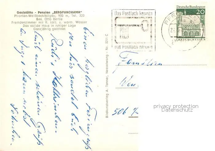 73841446 Pfronten Weissbach Pension Bergpanorama Gastraum Kirche Panorama Pfronten postalisch gelaufen nach 1965 Erhaltung siehe scans [WerneD78] [WernPID7 ]