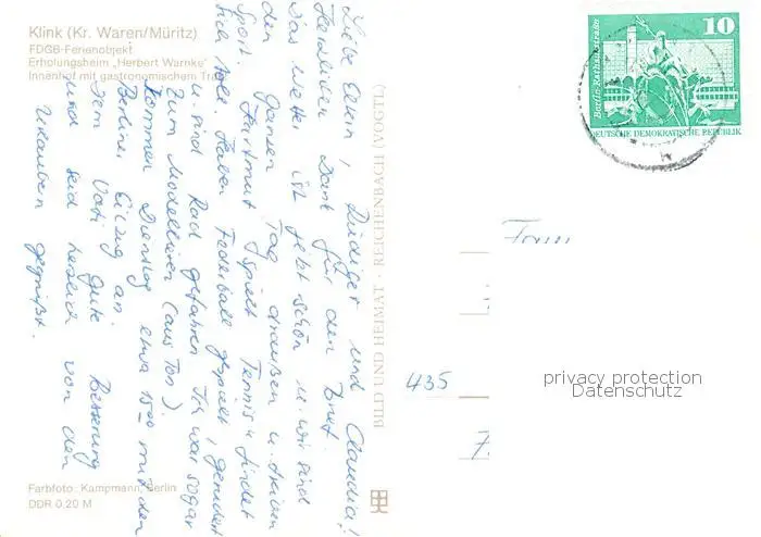 73841634 Klink_Waren FDGB Ferienobjekt Erholungsheim Herbert warnke Innenhof Klink Waren postalisch gelaufen nach 1965 Erhaltung siehe scans [WerneD78] [WernPID7 ]