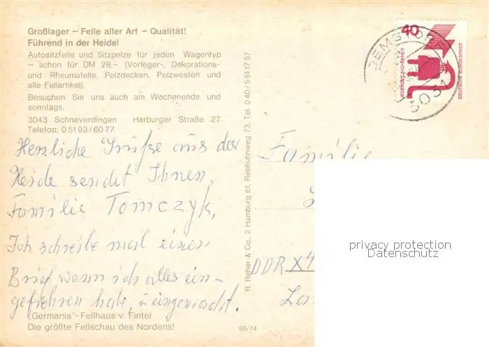 73841637 Schneverdingen Autopelz Grosslager Germania Fellhaus Felle aller Art Schneverdingen postalisch gelaufen 1977 Erhaltung siehe scans [WerneD78] [WernPID7 ]