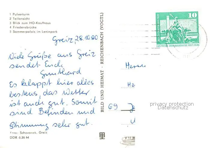 73842298 Greiz_Thueringen Pulverturm Teilansicht HO Kaufhaus Friedensbruecke Sommerpalais im Leninpark Greiz Thueringen postalisch gelaufen 1980 Erhaltung siehe scans [WerneD78] [WernPID7 ]