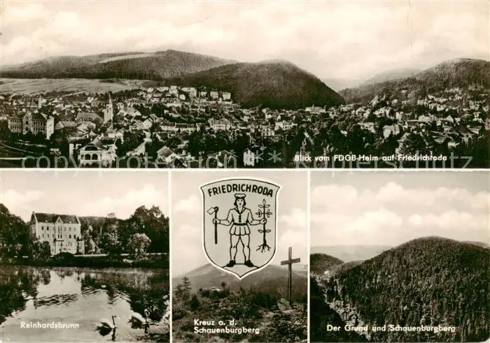 AK / Ansichtskarte 73842815 Friedrichroda Blick vom FDGB Heim Reinhardsbrunn Kreuz auf dem Schauenburgberg Der Grund Friedrichroda