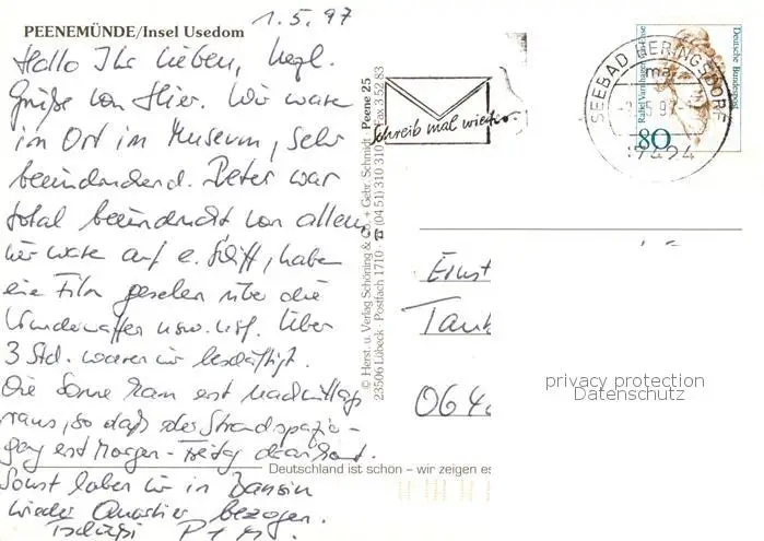73842889 Peenemuende Denkmal Fahrgastschiff Kapelle Motorflugzeug Rakete Historisch-Technisches Museum Peenemuende postalisch gelaufen 1997 Erhaltung siehe scans [FriedD77] [Frierer ]