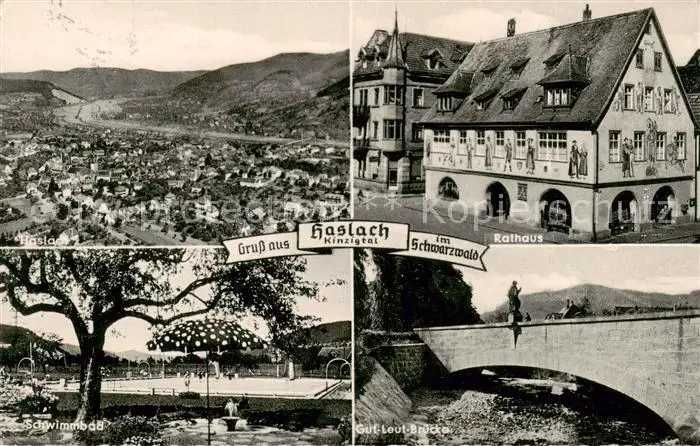 73843081 Haslach_Kinzigtal Luftbild Rathaus Schwimmbad Gut-Leut-Bruecke Haslach_Kinzigtal postalisch gelaufen 1950 Erhaltung siehe scans [FriedD77] [Frierer ]