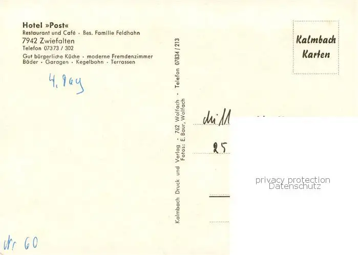 73844198 Zwiefalten_Wuerttemberg Hotel Post Gastraum Kirche Zwiefalten Wuerttemberg postalisch gelaufen nach 1965 Erhaltung siehe scans [WerneD78] [WernPID7 ]