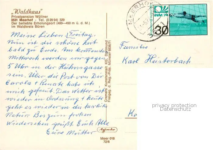 73844429 Meerhof Privatpension Waldhaus Fliegeraufnahme Meerhof postalisch gelaufen 1977 Erhaltung siehe scans [FriedD77] [Frierer ]