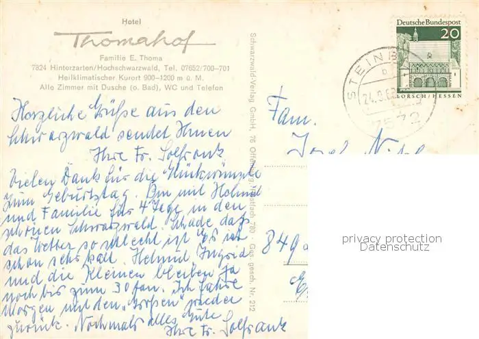 73844908 Hinterzarten Hotel Thomahof Hinterzarten postalisch gelaufen 1968 Erhaltung siehe scans [FriedD77] [Frierer ]