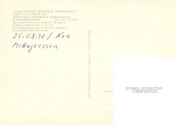 73844927 Nuernberg Bratwurst Roeslein Nuernberg Nuernberg postalisch nicht gelaufen nach 1965 Erhaltung siehe scans [FriedD77] [Frierer ]