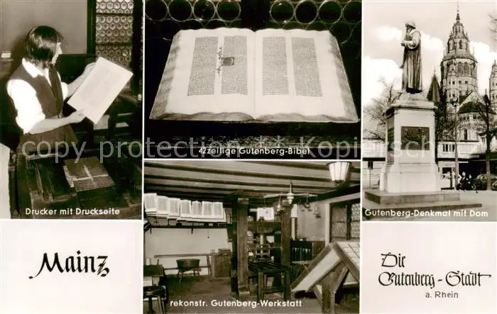 73845262 Mainz__Rhein Drucker mit Druckseite 42zeilige Gutenberg Bibel Gutenberg Werkstatt Gutenberg Denkmal mit Dom postalisch nicht gelaufen 1921-1965 Erhaltung siehe scans [FriedD77] [Frierer ]
