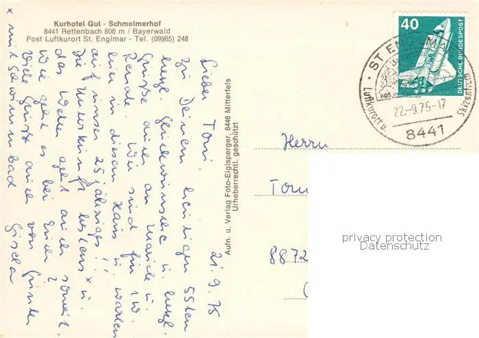 73845300 Rettenbach_Sankt_Englmar Gaestehaus Rettenbach Aussichtsturm am Hirschenstein Kurhotel Gut Schelmerhof Rettenbach_Sankt_Englmar postalisch gelaufen 1975 Erhaltung siehe scans [FriedD77] [Frierer ]