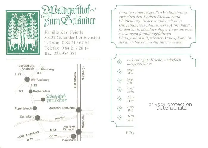 73845303 Gelaender_Eichstaett_Oberbayern Waldgasthof Zum Gelaender Gastraum Eingang postalisch nicht gelaufen nach 1965 Werbekarte (keine Postkarte) Erhaltung siehe scans [FriedD77] Werbekarte (keine Postkarte)[Frierer ]