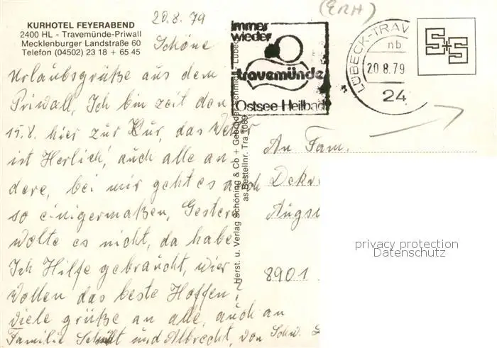 73845432 Priwall_Travemuende Kurhotel Feyerabend Gastraum Zimmer Finnjet Passagierschiff Priwall Travemuende postalisch gelaufen 1979 Erhaltung siehe scans [FriedD77] [Frierer ]