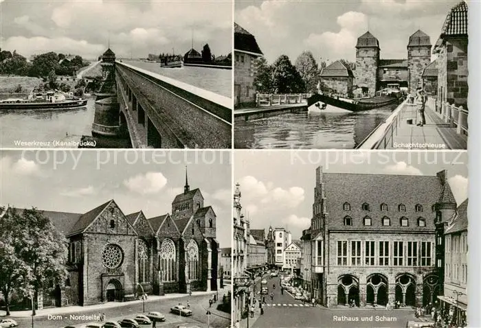 AK / Ansichtskarte 73846765 Minden__Westfalen_Weser Weserkreuz Kanalbruecke Schachtschleuse Dom Nordseite Rathaus und Scharn