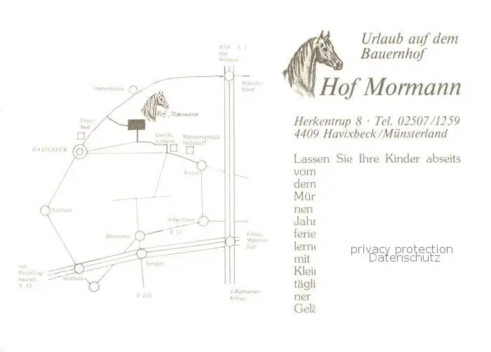 73847790 Havixbeck Urlaub auf dem Bauernhof Hof Mormann Reiterferien Reitstall Havixbeck postalisch nicht gelaufen nach 1965 Werbekarte (keine Postkarte) Erhaltung siehe scans [FriedD77] Werbekarte (keine Postkarte)[Frierer ]