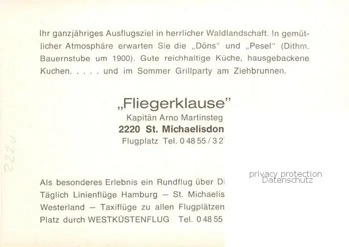 73847802 St_Michaelisdonn Fliegerklause Flugplatz Motorflugzeug Segelflugzeug Landschaftspanorama St_Michaelisdonn postalisch nicht gelaufen nach 1965 Werbekarte (keine Postkarte) Erhaltung siehe scans [FriedD77] Werbekarte (keine Postkarte)[Frierer ]
