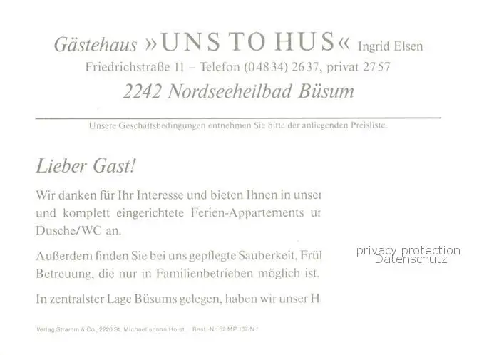 73847822 Buesum_Nordseebad Gaestehaus Uns To Hus Buesum_Nordseebad postalisch nicht gelaufen nach 1965 Werbekarte (keine Postkarte) Erhaltung siehe scans [WerneD78] Werbekarte (keine Postkarte)[WernPID7 ]