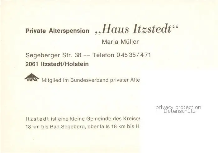 73847955 Bad_Segeberg Private Alterspension Haus Itzstedt Bad_Segeberg postalisch nicht gelaufen nach 1965 Werbekarte (keine Postkarte) Erhaltung siehe scans [FriedD77] Werbekarte (keine Postkarte)[Frierer ]