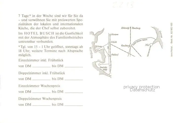 73848191 Wilster Hotel Busch Gaststube Kegelbahn Bar Wilster postalisch nicht gelaufen nach 1965 Werbekarte (keine Postkarte) Erhaltung siehe scans [FriedD77] Werbekarte (keine Postkarte)[Frierer ]