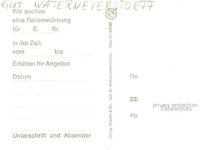 73848246 Waterneverstorf Gut Waterneverstorf Waterneverstorf postalisch nicht gelaufen nach 1965 Werbekarte (keine Postkarte) Erhaltung siehe scans [FriedD77] Werbekarte (keine Postkarte)[Frierer ]