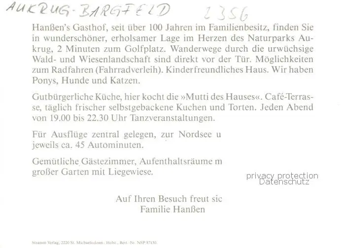 73848252 Bargfeld_Rendsburg Hanssen’s Gasthof Gastraeume Zimmer Bargfeld Rendsburg postalisch nicht gelaufen nach 1965 Werbekarte (keine Postkarte) Erhaltung siehe scans [FriedD77] Werbekarte (keine Postkarte)[Frierer ]