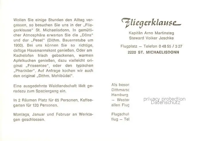 73848458 St_Michaelisdonn Cafe Restaurant Fliegerklause Bauernstube St_Michaelisdonn postalisch nicht gelaufen nach 1965 Werbekarte (keine Postkarte) Erhaltung siehe scans [FriedD77] Werbekarte (keine Postkarte)[Frierer ]