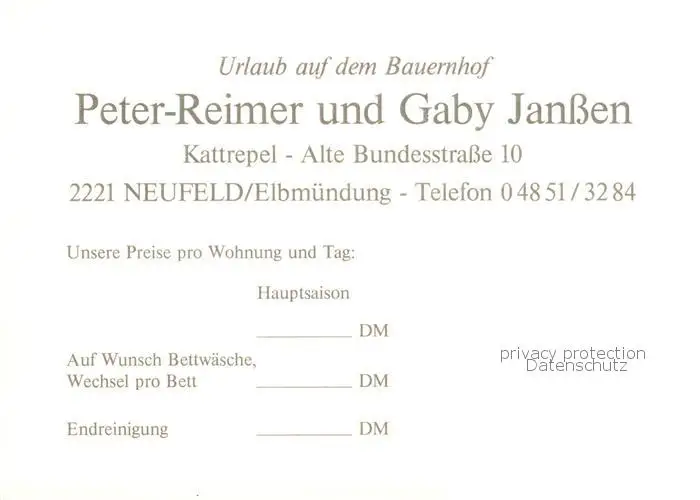 73848461 Neufeld_Dithmarschen Urlaub auf dem Bauernhof Ferienhaus Neufeld Dithmarschen postalisch nicht gelaufen nach 1965 Werbekarte (keine Postkarte) Erhaltung siehe scans [FriedD77] Werbekarte (keine Postkarte)[Frierer ]