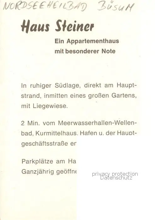 73848480 Buesum_Nordseebad Appartementhaus Haus Steiner Buesum_Nordseebad postalisch nicht gelaufen nach 1965 Werbekarte (keine Postkarte) Erhaltung siehe scans [FriedD77] Werbekarte (keine Postkarte)[Frierer ]