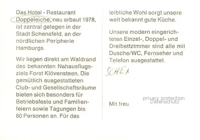 73848498 Schenefeld_Hamburg Hotel Restaurant Doppeleiche Schenefeld Hamburg postalisch nicht gelaufen nach 1965 Werbekarte (keine Postkarte) Erhaltung siehe scans [FriedD77] Werbekarte (keine Postkarte)[Frierer ]