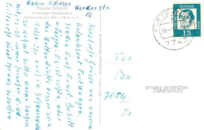 73848948 Furtwangen Pension Schmitz Furtwangen postalisch gelaufen 1965 Erhaltung siehe scans [WerneD78] [WernPID7 ]