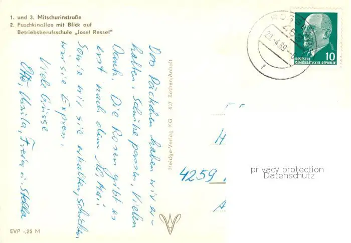 73849261 Rosslau_Elbe Mitschurinstrasse Puschkinallee mit Betriebsberufsschule Josef Ressel Rosslau_Elbe postalisch gelaufen 1969 Erhaltung siehe scans [WerneD78] [WernPID7 ]