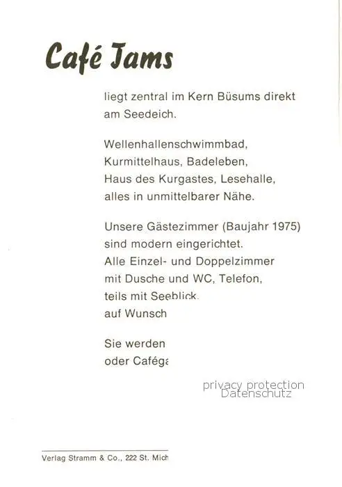 73849503 Buesum_Nordseebad Café Tams Buesum_Nordseebad postalisch nicht gelaufen nach 1965 Werbekarte (keine Postkarte) Erhaltung siehe scans [FriedD77] Werbekarte (keine Postkarte)[Frierer ]