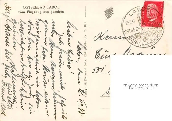 73850720 Laboe Fliegeraufnahme mit Marine Ehrenmal Laboe postalisch gelaufen 1933 Erhaltung siehe scans [FriedD77] [Frierer ]