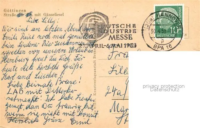73851600 Goettingen__Niedersachsen Strassenpartie mit Gaenselieselbrunnen postalisch gelaufen 1953 Erhaltung siehe scans [WerneD78] [WernPID7 ]