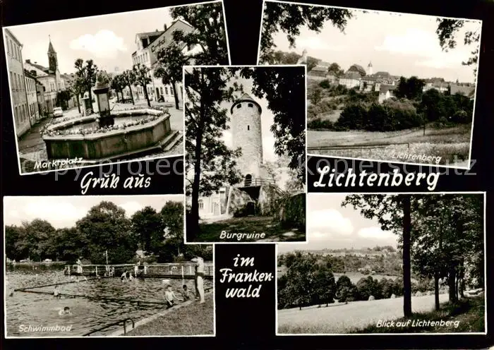 AK / Ansichtskarte 73852256 Lichtenberg_Oberfranken Marktplatz Burgruine Schwimmbad Panorama Blick auf Lichtenberg Lichtenberg Oberfranken