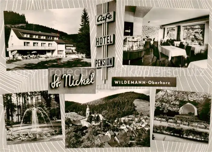 AK / Ansichtskarte 73852260 Wildemann_Harz Café Hotel Pension St. Nickel Springbrunnen Konzertpavillon