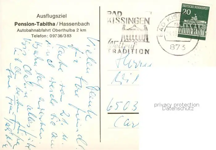 73852599 Hassenbach Gaestehaus Tabitha Pension Hassenbach postalisch gelaufen nach 1965 Erhaltung siehe scans [WerneD78] [WernPID7 ]
