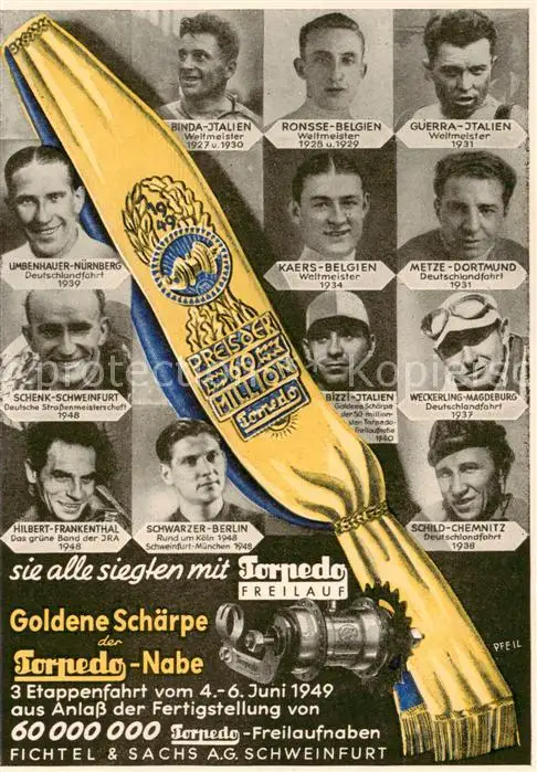 73852800 Schweinfurt Fichtel und Sachs AG Goldene Schaerpe der Torpedo Freilaubnabe Etappenfahrt im Juni 1949 Schweinfurt postalisch nicht gelaufen 1949 Erhaltung siehe scans [WerneD78] [WernPID7 ]