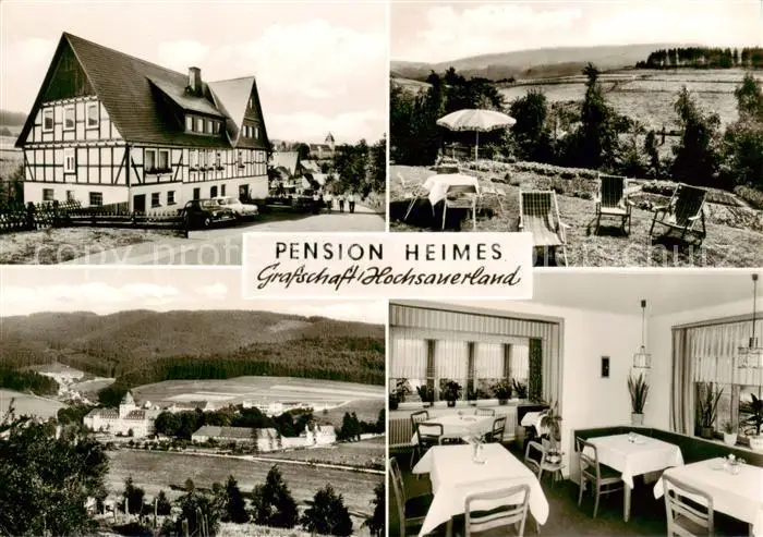 AK / Ansichtskarte 73852831 Grafschaft_Sauerland Pension Heimes Gartenterrasse Panorama Gaststube Grafschaft_Sauerland