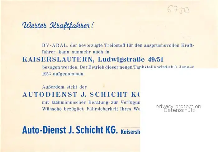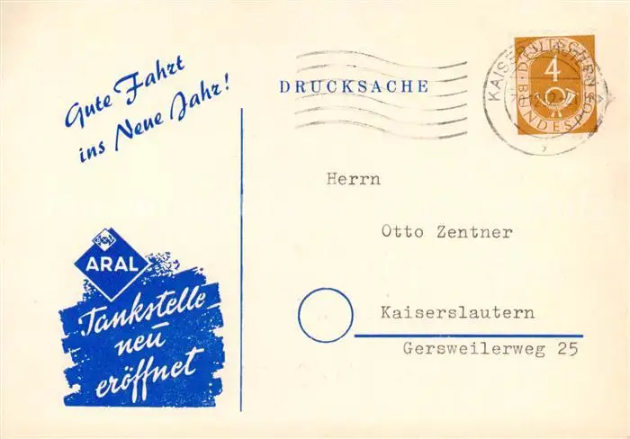 73852847 Kaiserslautern Neueroeffnung einer Aral Tankstelle Kaiserslautern postalisch gelaufen 1952 Erhaltung siehe scans [WerneD78] [WernPID7 ]
