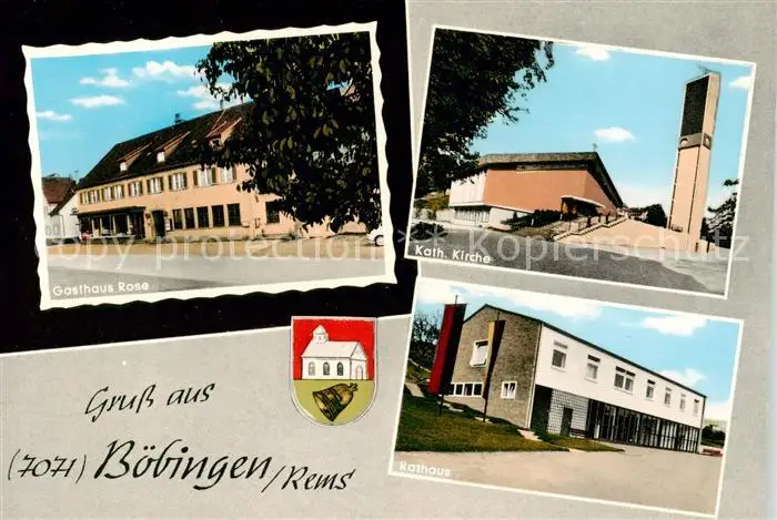 73852886 Boebingen_Rems Gasthaus Rose Kath Kirche Rathaus Boebingen Rems postalisch nicht gelaufen nach 1965 Erhaltung siehe scans [WerneD78] [WernPID7 ]